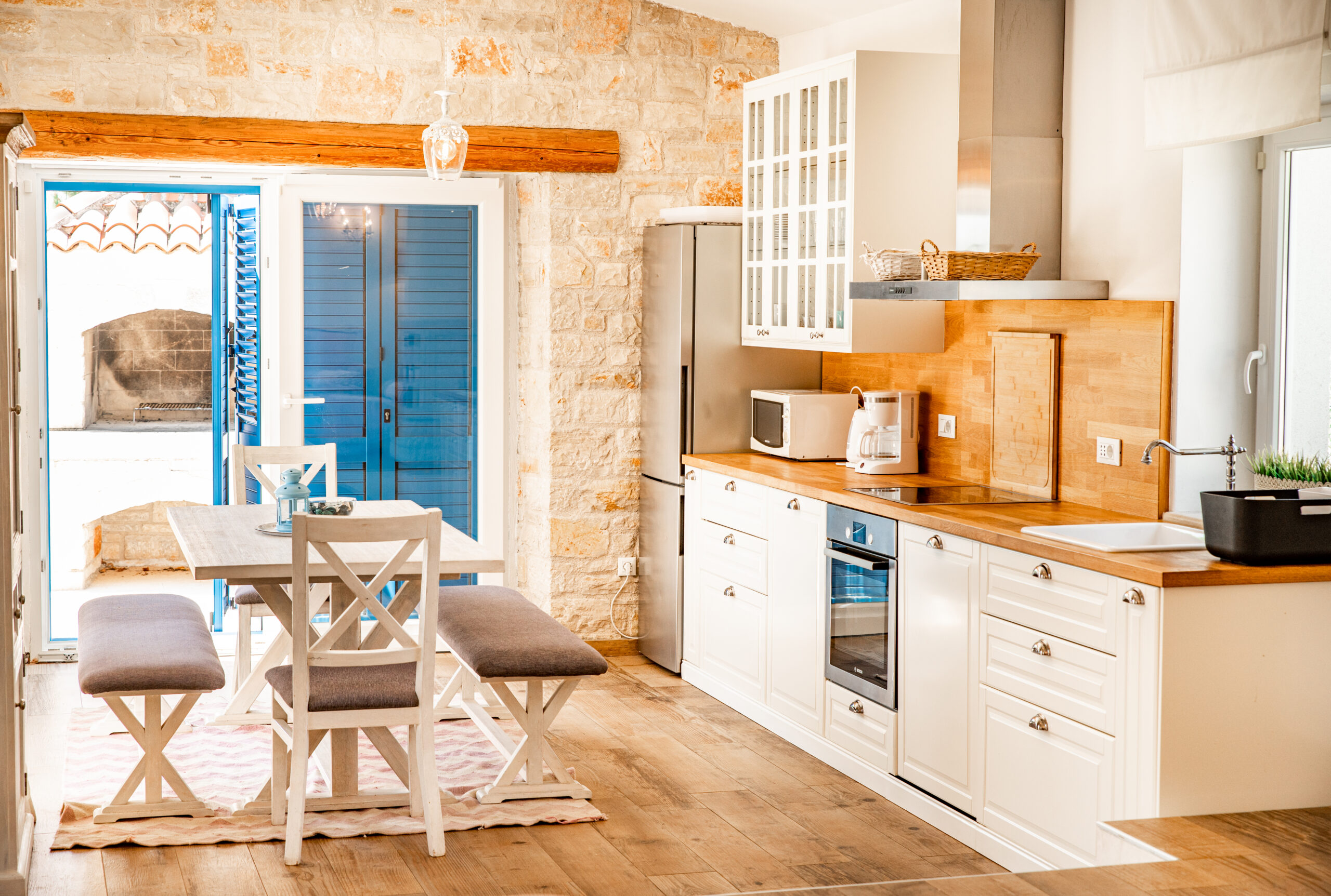 U prizemlju se nalazi otvoreni dnevni boravak koji Vas poziva da se samo opustite i uživate u zasluženom odmoru. Povezan je sa potpuno opremljenom kuhinjom i blagovaonicom, koja je izvrsna za uživanje u ukusnim jelima zajedno sa svojim najmilijima. Sve tri spavaće sobe u kući imaju vlastite kupaonice s tušem. Jedna spavaća soba s bračnim krevetom smještena je u prizemlju, dok se druge dvije nalaze na gornjem katu. Jedan od aduta ove kuće je sauna koja se nalazi u prizemlju ove vile.
